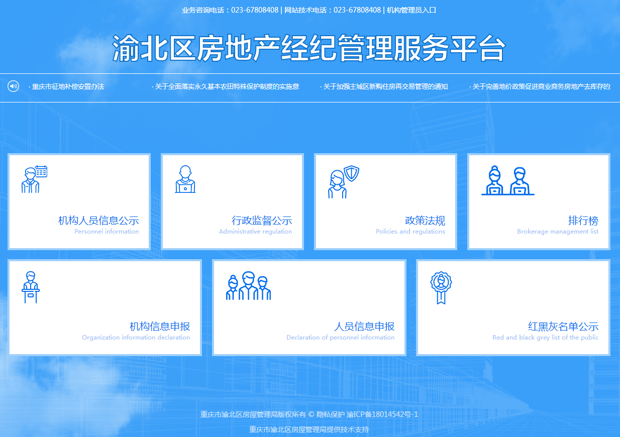 PRESS CENTENR城(cheng)銀科技政企信息事業部多年(nian)來服務過數百家企事業單位,所定制開(kai)發的軟件(jian)都(dou)得到客戶的一(yi)致好評。2018年(nian)10月我司(si)受重(zhong)慶渝(yu)北區房(fang)管(guan)局委托,為渝(yu)北區房(fang)管(guan)局定制開(kai)發房(fang)地產經紀監管(guan)服務平臺。