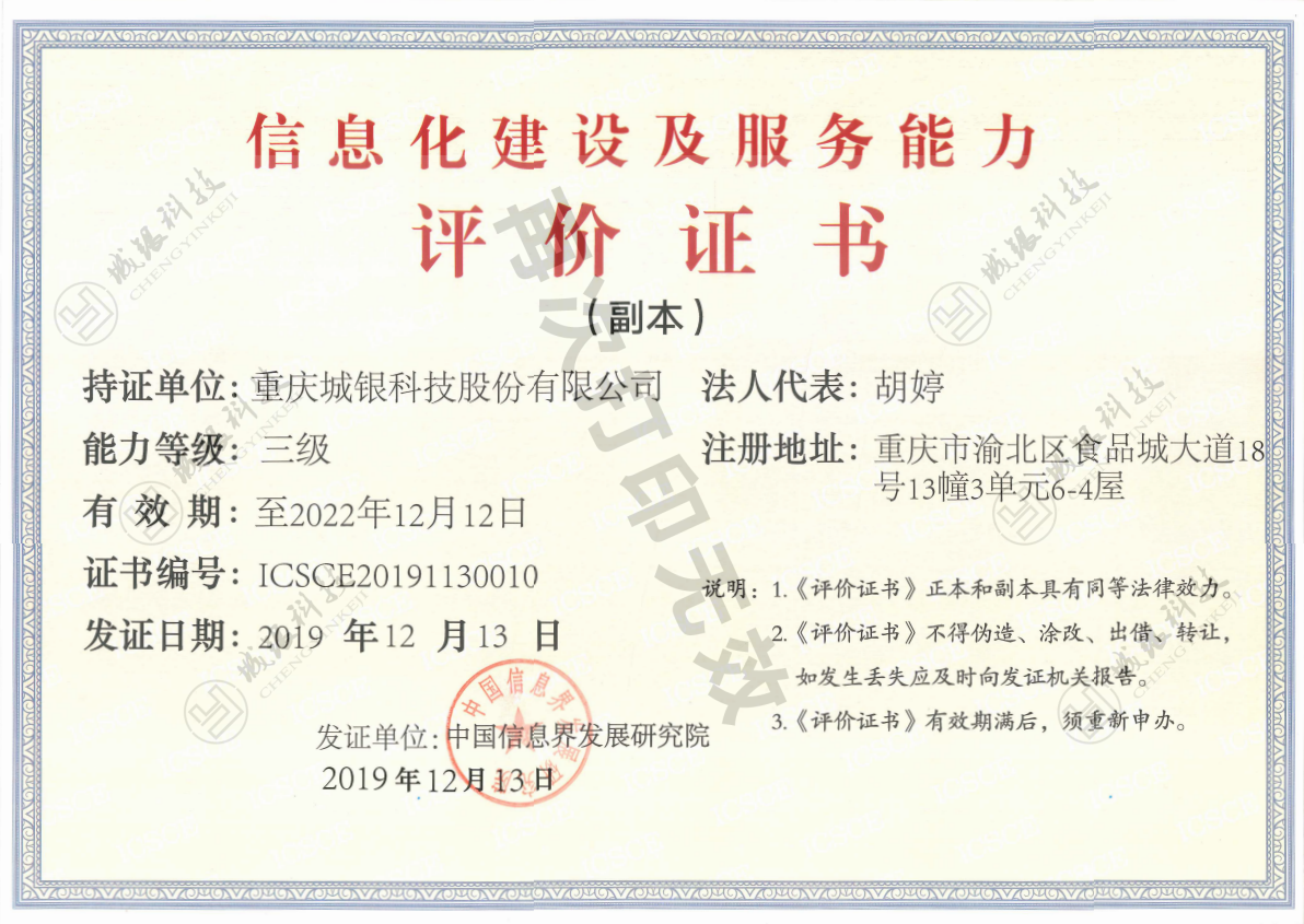 PRESS CENTENR2019年12月(yue)13日,中(zhong)國信息界(jie)發展研究院向(xiang)重(zhong)慶城(cheng)銀科技(ji)股份有(you)限公司等45家企業頒發了首批《信息化(hua)建設服務能力評價證書》,標志(zhi)著城銀股份信息化建設及服務工作的進一步完善,綜合能力和水平更上一個臺階!此次(ci)信息化建設服務能力的(de)認證,將進一(yi)步提升(sheng)城銀股份(fen)的綜合水平,有(you)效激發創新活力(li)、增強市場競爭力(li)。
