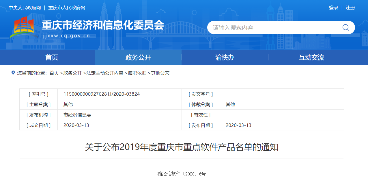 PRESS CENTENR近日(ri),重慶市經濟和信(xin)息化委(wei)員(yuan)會公布了(le)“2019年度重慶市重點軟件和信息服務企業名單”及“2019年度重慶市重點軟件產品名單”。其中,重慶城銀科技股份有限公司榮獲了“重慶市重點軟件和信息服務企業”中“創新型企業(ye)”的稱號,同時,公司自主研發的“城銀智慧便民服務平臺”獲得了“重慶市重點軟件產品”的榮譽稱號,可謂雙喜臨門!